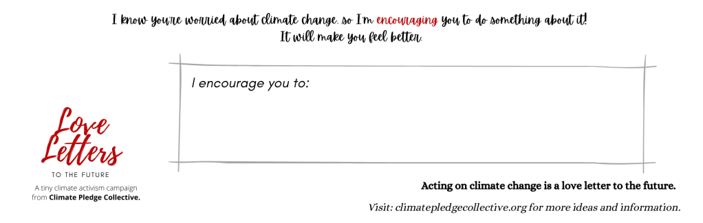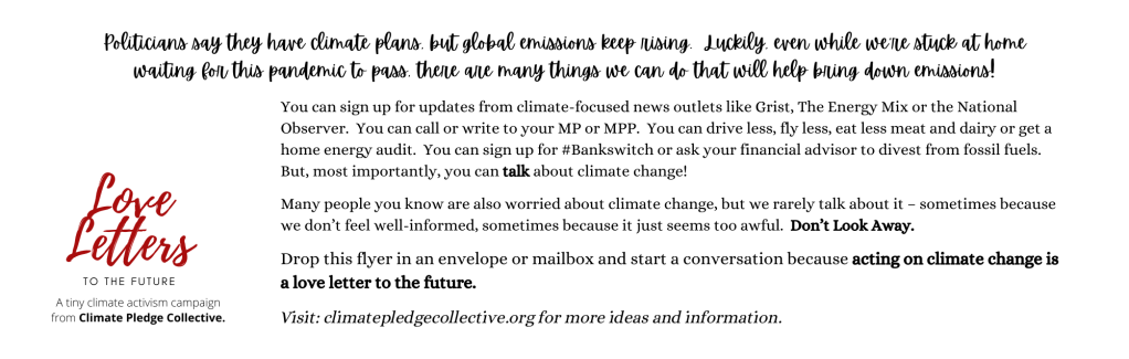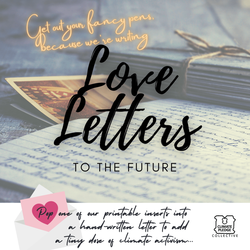 We also have pamphlet style PDFs of our full climate pledge which fit nicely into an envelope available. No ‘Love Letter’ branding here, but they give the widest range of climate action ideas.