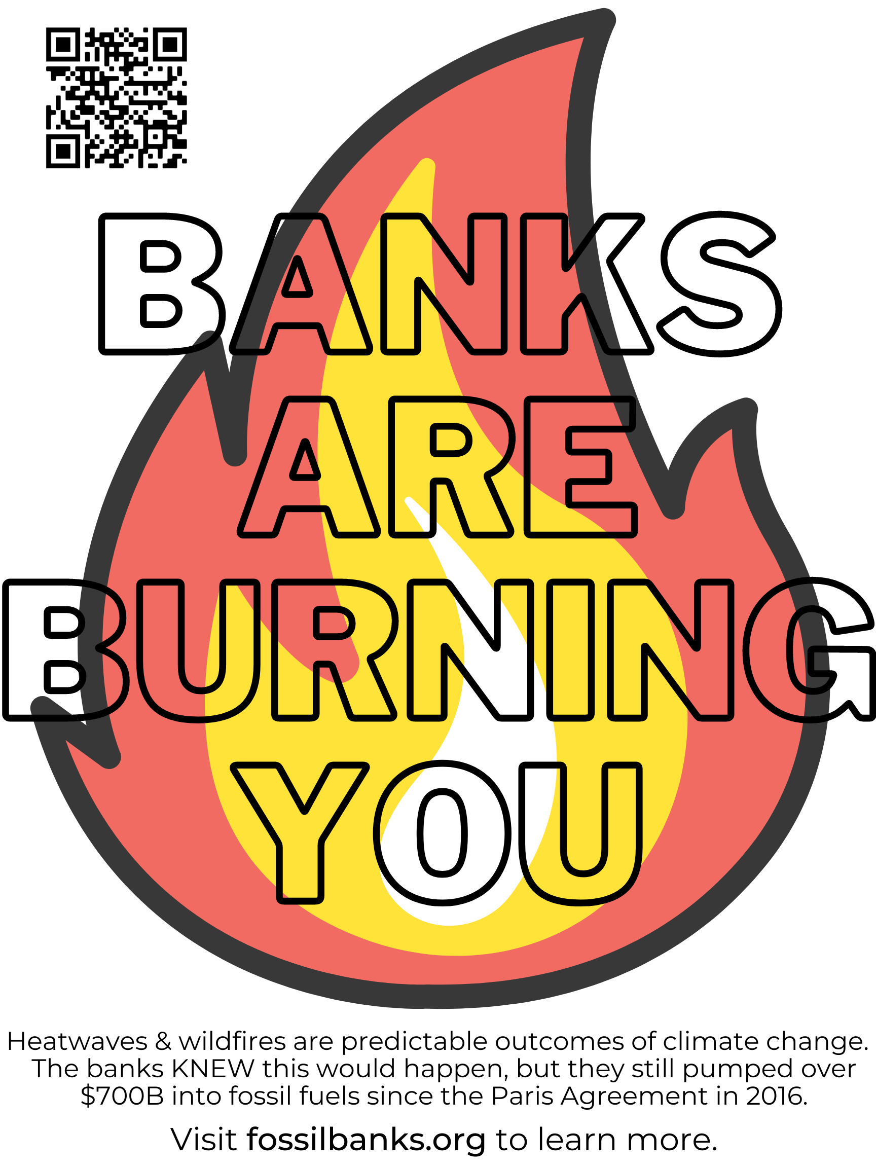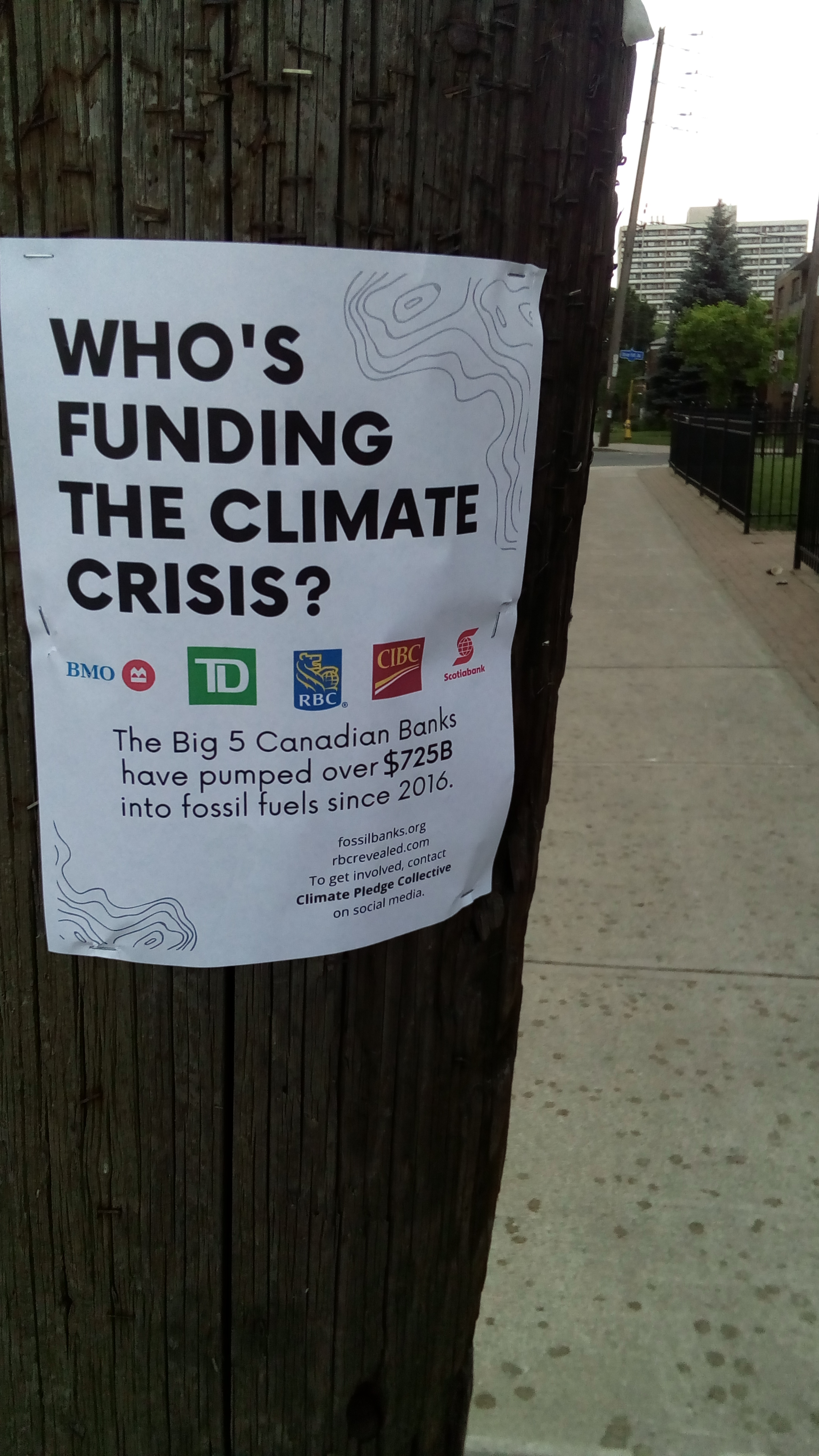 We’ve got FOUR POSTER STYLES (including one designed by the youngest member of Climate Pledge Collective) for you to download (PDF) and put up in your neighbourhood. When the weather is nice, postering alone or in a group is actually a very pleasant way to take action on climate change. And since most people don’t know the Big 5 Banks have poured hundreds of billions into fossil fuel expansion in recent years — these posters have a BIG IMPACT.