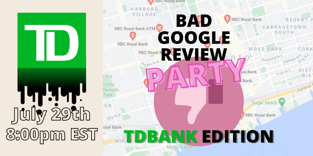 People had a lot of fun at our first Bad Google Review Party, SO WE’RE DOING IT AGAIN. On July 29th at 8PM on Zoom, we’re having a second edition with a focus on TD Bank! RSVP on EVENTBRITE to get the Zoom Link. All the banks have their own special reasons that they might be the worst climate criminals — for TD, it’s the fact that they run a ‘Friends of the Environment Foundation’ and fund things like eco-schools while also stealing children’s future by pouring billions into fossil fuel expansion, year after year after year. Yuck!